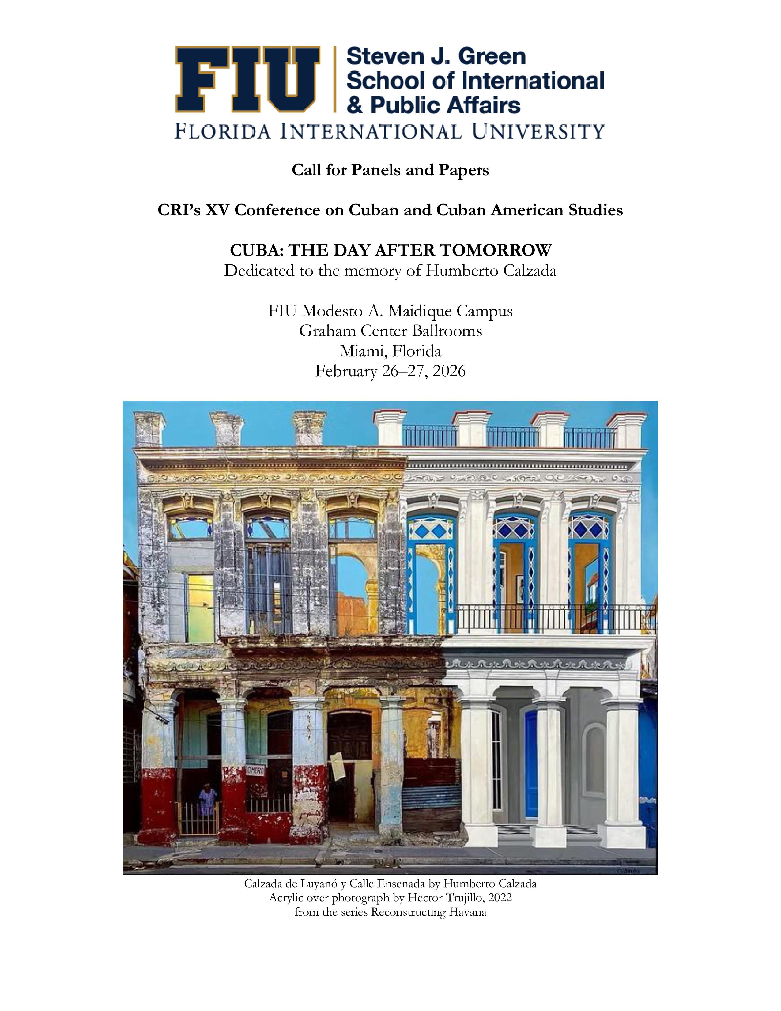 The Cuban Research Institute (CRI) of Florida International University (FIU) continues its tradition of convening scholars and other persons interested in the study of Cuba and Cuban Americans by announcing its Fifteenth Conference, dedicated to the memory of the distinguished Cuban American artist Humberto Calzada. We encourage the submission of panels and papers concentrating on any aspects of the main conference theme, but will consider all submissions relevant to the history, economy, politics, culture, society, and creative expression of Cuba and its diaspora. The conference will be held in person and will not be available online.