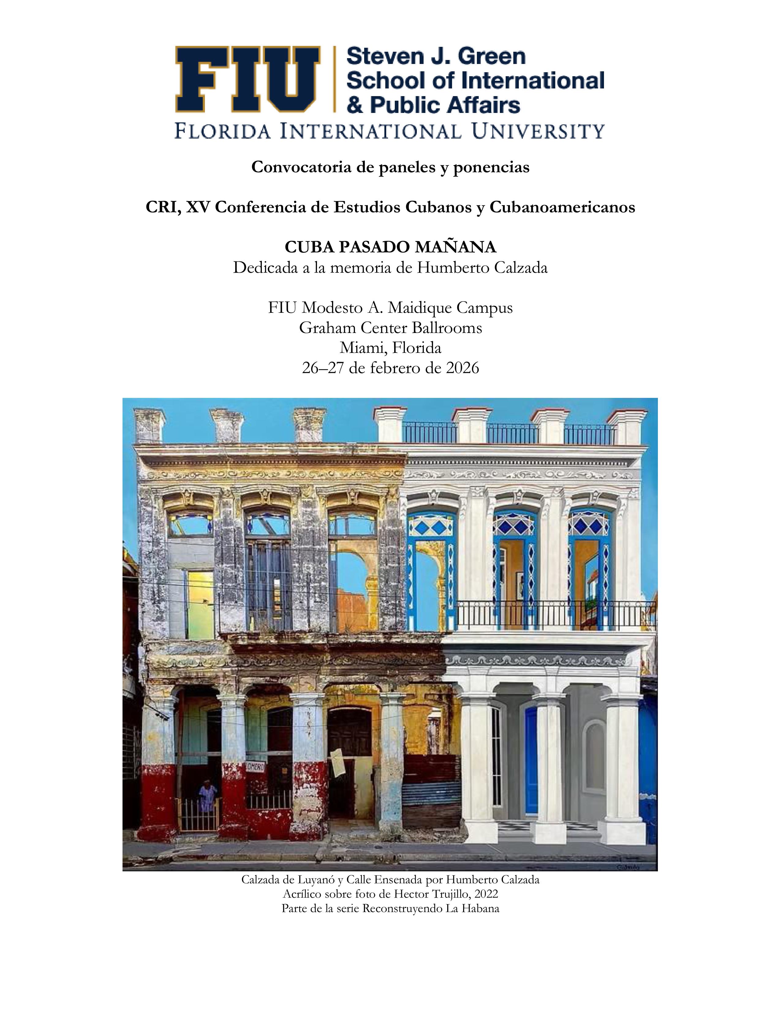 El Instituto de Investigaciones Cubanas (CRI, por sus siglas en inglés) de la Universidad Internacional de la Florida (FIU) continúa su tradición de convocar a académicos y otras personas interesadas en el estudio de Cuba y los cubanoamericanos, anunciando su Decimoquinta Conferencia, dedicada a la memoria del distinguido artista cubano americano Humberto Calzada. Aunque preferimos la presentación de paneles y ponencias que se concentren en el tema principal de la conferencia, consideraremos otras presentaciones relevantes para la historia, la economía, la política, la cultura, la sociedad y la expresión creativa de Cuba y su diáspora. La conferencia se llevará a cabo en persona y no estará disponible en línea.